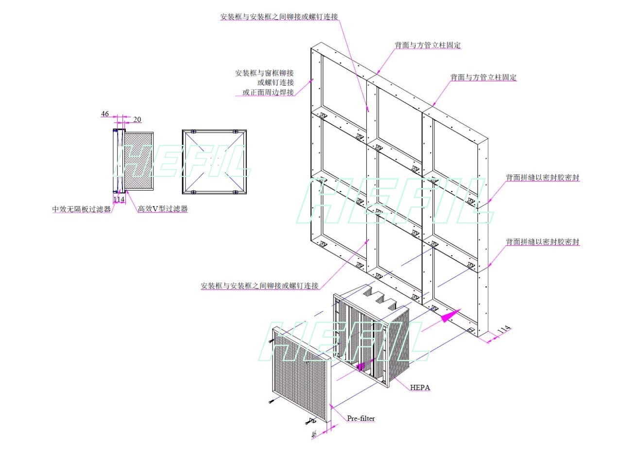 ◆安裝框結構簡單,通用性強,可按所需風量組合于集中通風或空調系統的預過濾