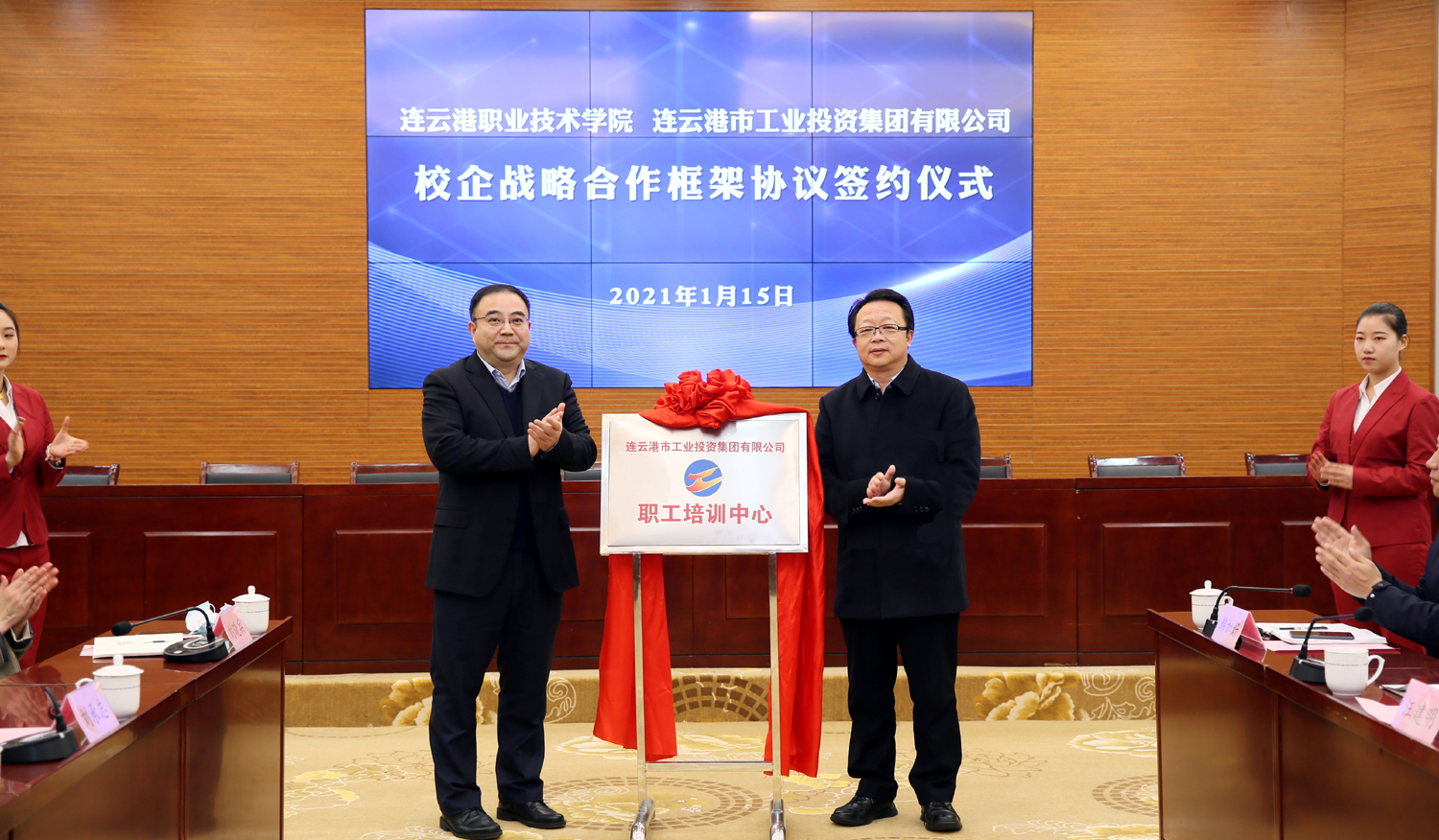 為深入推進產業工人隊伍建設改革,搭建職工教育培訓平臺,115日,在連云港職業技術學院舉行校企合作簽約儀式,并為集團公司職工培訓中心揭牌。集團公司黨委書記、董事長楊龍,工會主席劉承志,總經濟師陳如軍;連云港職業技術學院黨委副書記、校長駱汝九,副校長葛仁福、汪建明等領導出席活動。