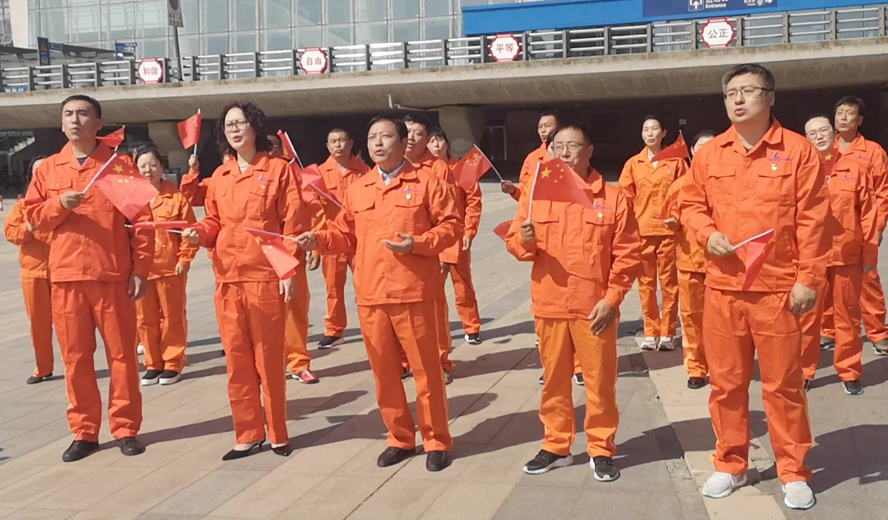 活動現場,身著亮橙色工作服的華茂員工,人手一面紅旗,不少青年員工在臉上身上貼上各式小紅旗,眾多圍觀群眾和往來旅客紛紛被氣氛感染自發加入宣傳隊伍,共同唱起《我和我的祖國》,大家臉上洋溢的不只是自豪,更是努力干事創業的動力。