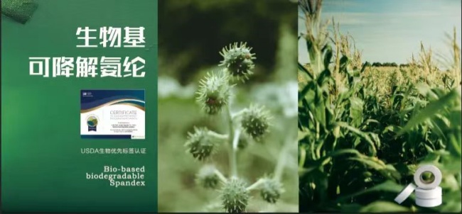 公司以蓖麻油和玉米秸稈為原料,開發出生物基可降解氨綸,其生物碳含量最高可達 75%,獲得美國農業部 (USDA)生物優先標簽認證,產品具有生物可降解性能,在 75 天內生物降解率可達到 11%,產品生產過程對環境環境影響小,根據SGS對產品全生命周期評估,生物基可降解氨綸相對常規氨綸產品可以減少50%的碳排放,此外,產品具備優異的酸性可染功能和耐氯功能。