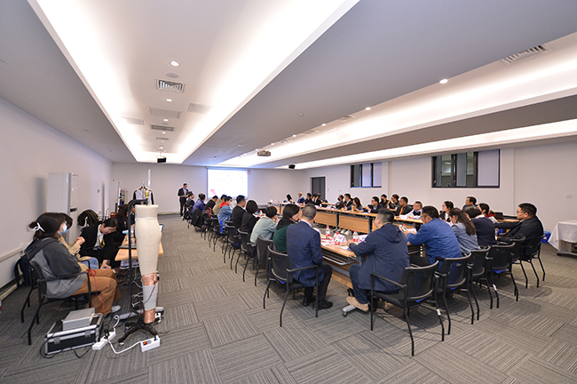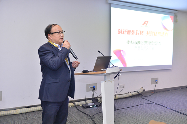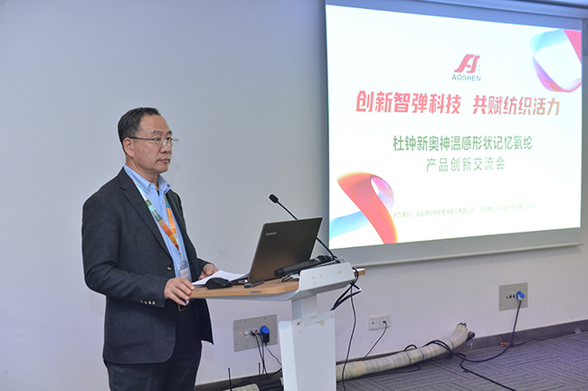 交流會上,杜鐘氨綸研發(fā)部曾登部長就奧神溫感形狀記憶氨綸的開發(fā)背景、產(chǎn)品特性以及應(yīng)用前景作了深入解析。參會嘉賓在對溫感形狀記憶氨綸有了較為清晰的認(rèn)知和了解后,圍繞該產(chǎn)品的功能特點并結(jié)合自身產(chǎn)品開發(fā)方向,展開了一場智慧碰撞,對溫感形狀記憶氨綸的創(chuàng)新應(yīng)用提出了獨到的建議和暢想。