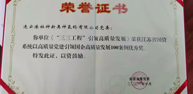 日前,杜鐘氨綸公司《“三三工程”引領(lǐng)高質(zhì)發(fā)展》榮獲江蘇省國資系統(tǒng)以高質(zhì)量黨建引領(lǐng)國企高質(zhì)量發(fā)展100案例優(yōu)秀獎。