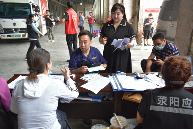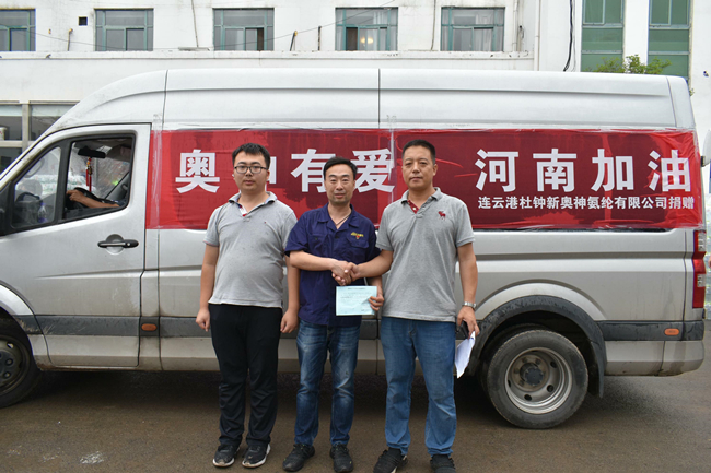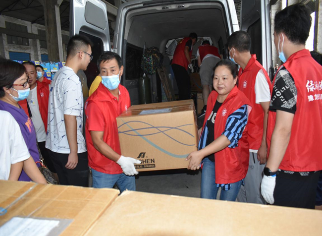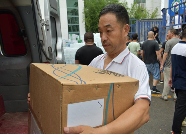 中午十二點,第一批物資捐贈后,顧不得吃飯我們就奔赴第二個捐贈點滎陽紅十字會。路上交警為我們耐心引導,仔細說明哪里有塌方,哪里可以通行,臨行還貼心的留下微信號碼,囑咐道:在鄭州遇到困難隨時聯系。到達后不出意外的開始排隊,看著其他志愿者熱火朝天的忙碌,我和同行的小孫心里很不是滋味:我們千里迢迢帶著集團公司黨委和公司黨委的重托和港城人民的美好祝愿來到災區,我們不僅僅是要來捐贈物資,是不是也該做點什么?幾經請示,紅會組織人員終于答應了我們的請求,同意我們作為臨時志愿者加入搬運捐贈物資的隊伍。雖然大家已經兩天沒合眼了,但是當穿上志愿者馬甲后,我們頓時精神煥發,立刻投入到緊張有序的搬運工作中。托舉起每一件來自祖國各地捐贈物資,心里都暖暖的,因為這里充滿了來自大江南北人們深深的祝福,激動的心情難以言表。此刻,我們對“眾志成城”有了更深刻的理解。