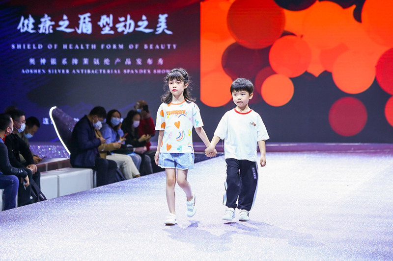 杜鐘新奧神氨綸公司總經理張斌向大家介紹了公司的發展歷程,并隆重推出新產品——銀系抑菌氨綸,指出其在性價比、環保、安全等方面獨特的優勢和市場前景。下游客戶代表紅豆童裝、福建東龍針紡分享了使用奧神抑菌、驅蚊等功能性氨綸產品的經驗和體會,并表示將與杜新奧神氨綸開展長期的戰略合作。最后,精彩的模特走秀完美演繹了兩家合作公司聯合推出的最新款的時裝、童裝及瑜伽類運動服裝。