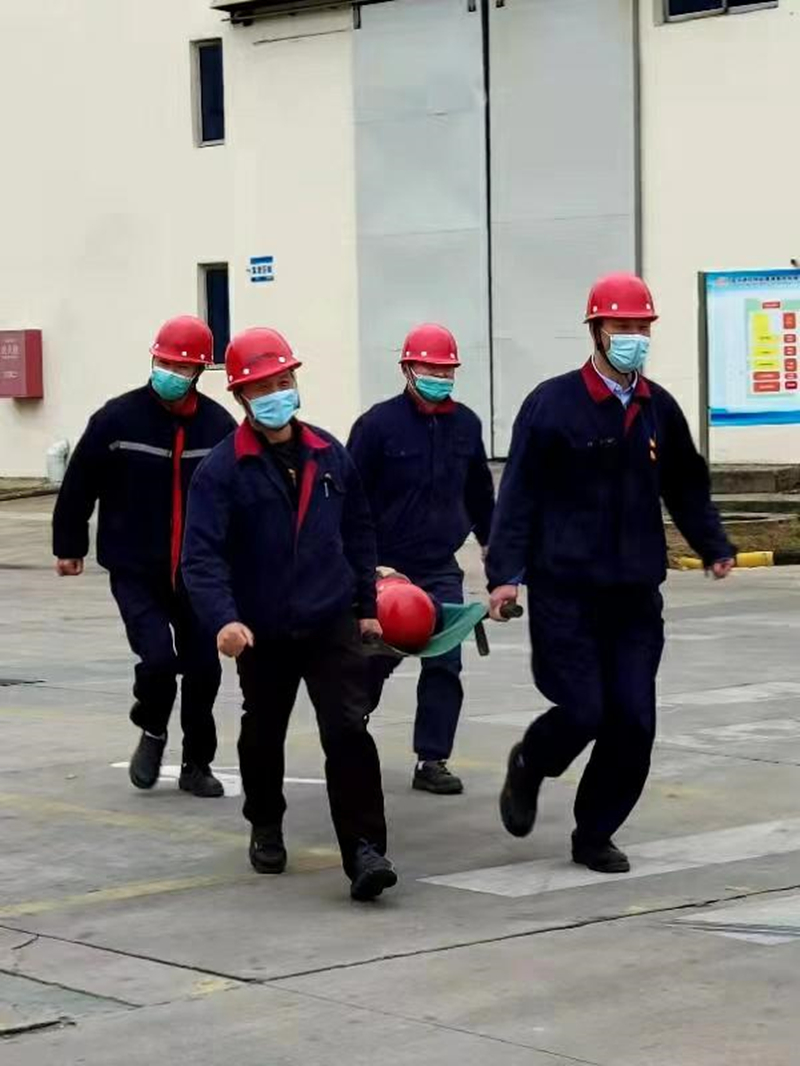 下午14:00消防控制中心檢測到八期胺房可燃?xì)怏w探測器報(bào)警,立即通知當(dāng)班操作人員。經(jīng)現(xiàn)場查看確認(rèn)為胺房化學(xué)品發(fā)生泄漏,并有人員暈倒,立即匯報(bào)。公司領(lǐng)導(dǎo)啟動(dòng)應(yīng)急預(yù)案,要求立即開展搶險(xiǎn)救援,ERT人員迅速集結(jié)。在現(xiàn)場總指揮的命令下,警戒組、疏散組、救援組、現(xiàn)場處置組各司其職。隔離現(xiàn)場、撤離相關(guān)區(qū)域人員、轉(zhuǎn)移傷員,現(xiàn)場處置組身穿防化服、佩戴防毒面具、攜帶防爆工具進(jìn)入現(xiàn)場,對泄漏點(diǎn)進(jìn)行緊急處置。經(jīng)過緊張?zhí)幚恚鹿孰U(xiǎn)情得到控制,現(xiàn)場大氣環(huán)境與水體檢測均達(dá)標(biāo),傷者脫離危險(xiǎn),演練達(dá)到了預(yù)期效果。