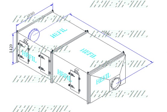 ◆為了結構緊湊,可設計成一個門。初中高效多級過濾采取側裝抽拉式,風機裝在箱體出風口,箱體兩端進出風口徑與現場管道匹配