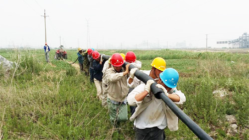 16日上午6點鐘左右,該所集合全部力量趕赴縱4路工程現場。在施工過程中,由于電纜線外套波紋管工作無法用機械完成,只能人工作業。該所除登高和外派作業人員外,其余人員密切配合,通力協作。他們不分工種、不計得失、不遺余力,喊著口號、邁著步子,用肩膀抗著波紋管,一步一個腳印,終于在中午12點成功將150米電纜套上波紋管。結束后才發現很多人的肩膀都磨出了淤血。為了搶在市網送電之前完成線路改造,該所在中午1點左右繼續趕工,最終在3點前將線路鋪設到位。(張偉孫維兵)