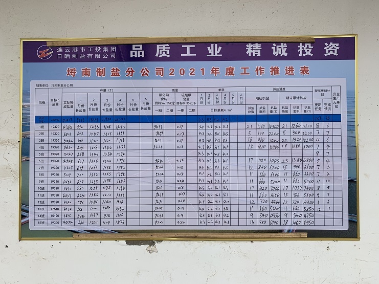 張貼二季度工作推進表,清晰的反映出目前的原鹽產量、質量、單耗、以及春季扒鹽情況。分公司經理程龍要求各個片區負責人按照表上反映的數據,查漏補缺,強化生產工作。在提高單產、降低單耗上下功夫,強化“三雨操作”加強結晶管理,嚴格除硫生產工藝,充分利用粉鹽化鹵,下馬格、副廩基等有效面積窮制鹵水,最大限度地降低鹵耗,提高單產加快扒鹽進度強化扒鹽產量保證安全工作