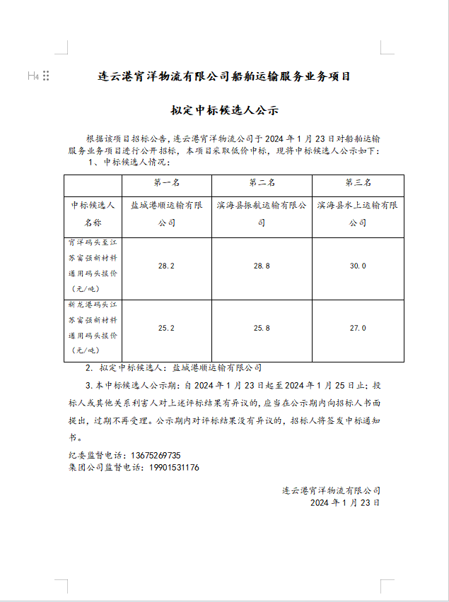 連云港宵洋物流有限公司船舶運(yùn)輸服務(wù)業(yè)務(wù)項(xiàng)目擬定中標(biāo)候選人公示