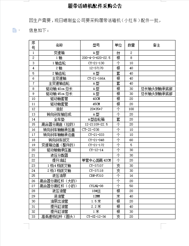 履帶活碴機配件采購公告