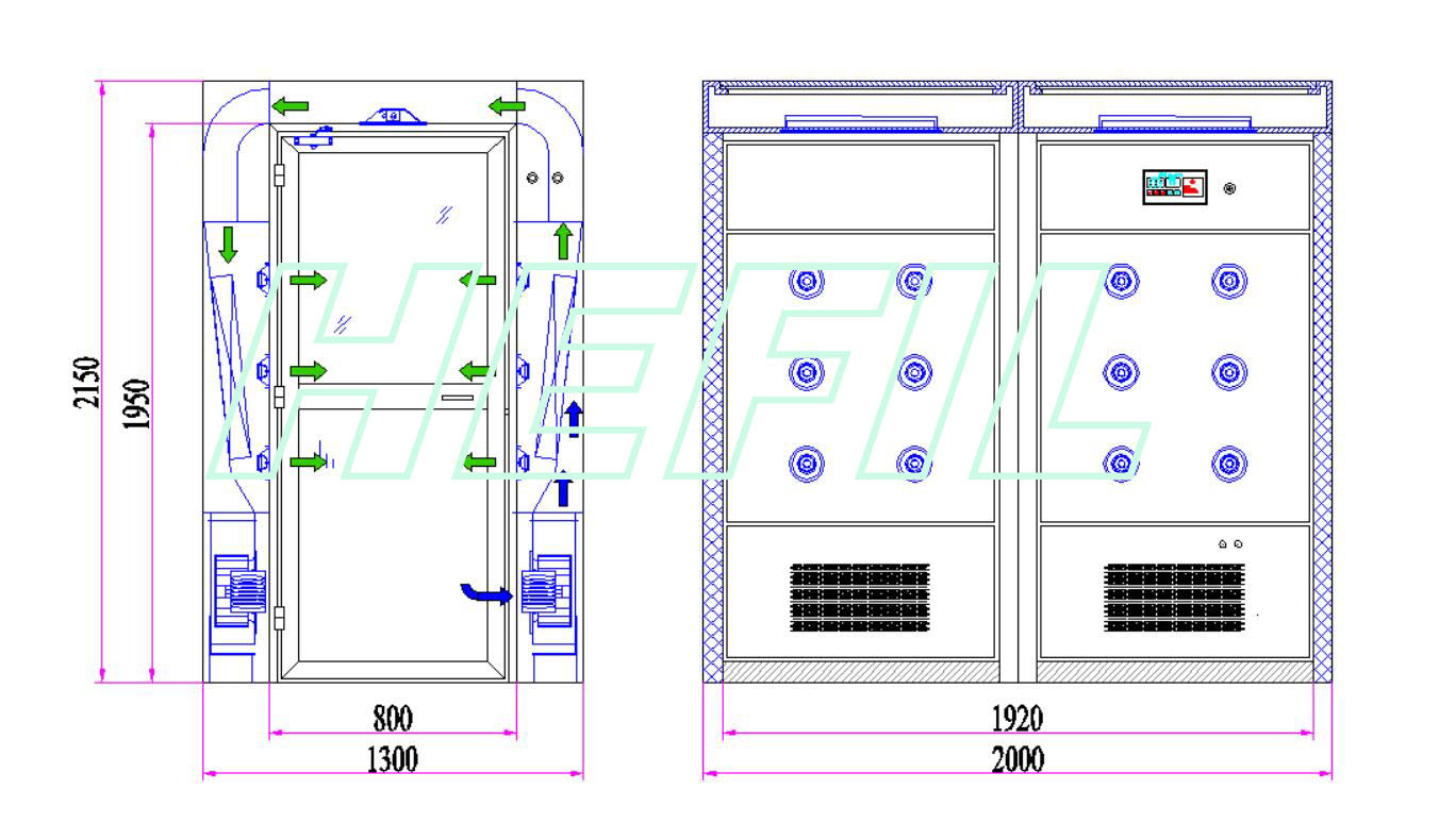 ◆HAS系列風淋室是潔凈廠房和裝配式潔凈小室的配套設備。用于吹除進入凈化廠房的人員和攜帶物品表面附著的塵埃,同時風淋室也起到氣閘的作用,防止未經凈化的空氣進入潔凈區域。是進行人身凈化和防止室外空氣污染潔凈區的設備。