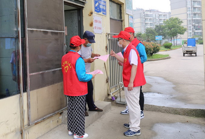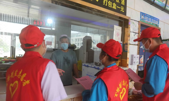 組織志愿者到板橋社區內的飯店、居民區等地分發《疫情防控倡議書》和疫情防控知識手冊