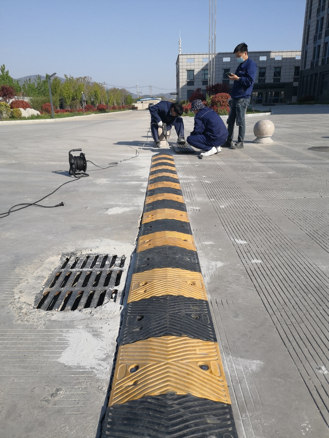 為了強化道路交通安全,公司在廠區主大門入口和停車場兩處加設減速帶。圖為安全管理部員工在現場施工。