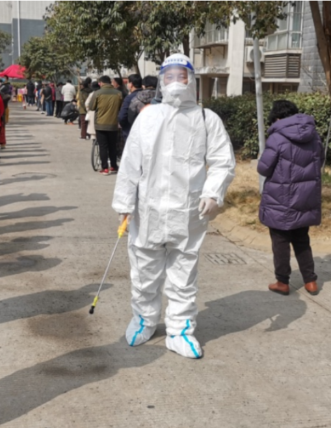 ? ?黨員尹永明,穿好防護服,帶上手套,口罩和防護眼鏡,背上30多斤的便攜式噴射器全身“武裝”,變成“大白”開始了一天的工作,從早上7點開始“打起精神努力干”到下午1:30“拖著疲憊的雙腿結束”。