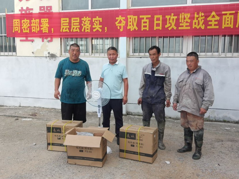 15臺(tái)風(fēng)扇陸續(xù)送至“先鋒、昌圩、大浦”三個(gè)礦鹽班組,公司領(lǐng)導(dǎo)一邊親手為職工進(jìn)行安裝,一邊與他們親切交談,詳細(xì)了解職工需求,充分肯定他們不畏艱辛、吃苦耐勞的奉獻(xiàn)精神,叮囑他們做好防暑措施,保障身心健康,同時(shí)保障生產(chǎn)作業(yè)安全平穩(wěn)。