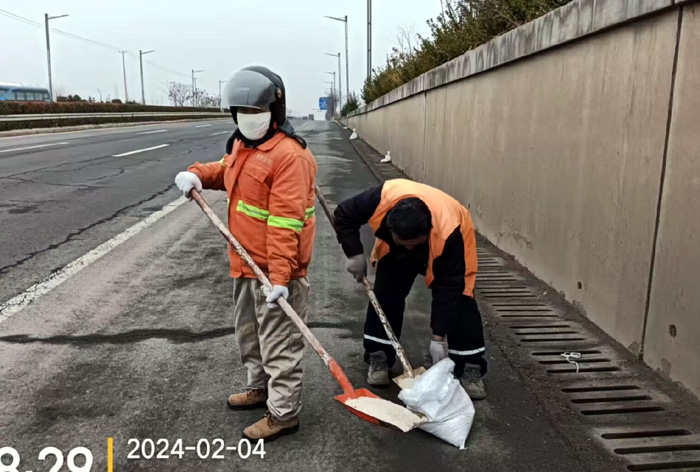 該分公司黨員突擊隊兵分3路,分別來到徐圩大道、港前大道、海濱大道核心路段。生產骨干沈萬軍、李傳武、張樹華等同志他們相互配合,手拿鐵锨簡單有效的進行撒放融雪劑60余噸。發現道路低洼結冰處及車輛轉彎口,他們立即下車利用雪鏟,有來有回的將冰凍鏟除,消除路面一切安全隱患。